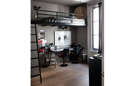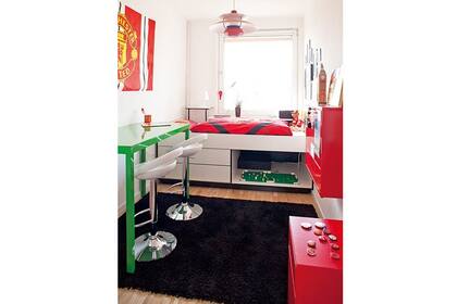 Un aprovechamiento eficiente del espacio: la cama alta permite aprovechar el espacio que queda debajo de ella para ubicar el escritorio. Aquí se optó por un par de caballetes y un tablón de melanina negro. | Foto:
