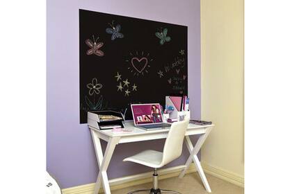 Una buena forma de sectorizar el escritorio es utilizar pintura de pizarrón sobre el sector de la mesa. No sólo funciona como límite del espacio sino que además sirve para anotar recordatorios. | Foto: