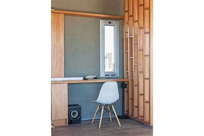 FINÍSIMO. Con un panel de madera –que se puede usar como biblioteca y zona de apoyo, o bien dejar libre a modo de biombo– se separó de forma funcional y liviana una sintética posta de labores o estudio del comedor. En idéntico material, dos ‘líneas’ (una como mesa y otra como estante superior, que desembocan en un placard cerrado) dan forma a un escritorio que se luce por su sencillez.