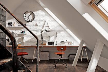 AIRE Y LUZ. La buhardilla, el altillo o algún recoveco con techo a dos aguas que estamos desperdiciando (o usando de espeluznante depósito) se puede convertir en luminoso y agradable espacio de trabajo. Basta con sumarle cerramientos en el techo, como este modelo de Velux enchapado en madera, para ganar productivos metros.