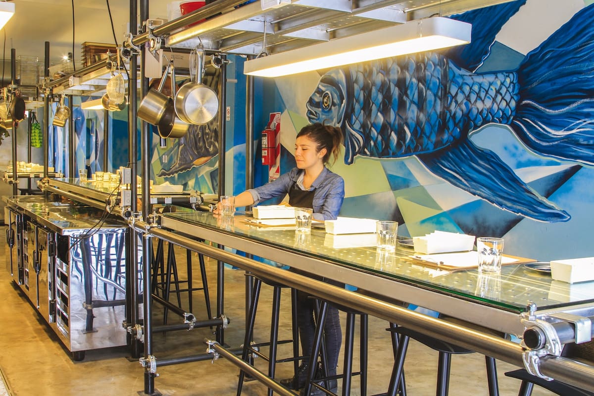 Ajo Negro, una primicia más entre las novedades que los barrios de Buenos Aires proponen a los que quieren siempre comer bien, a cualquier nivel. Esta vez, un modelo de gastronomía diferente en su puesta entre bar, restó y mostrador, informal onda mercado asiático o street food, pero no en la calle y con la cocina a la vista. El acero es protagonista, como el andamiaje de una construccióny sostiene la barra de diez metros, con bancos altos y cómodos. Enfrente, un enorme mural-pecera contiene un mostrador más angosto con banquetas de altura normal.