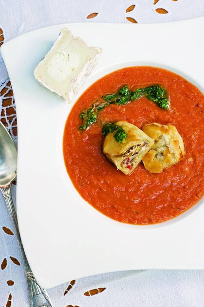 Cortar las berenjenas en láminas de 1/2 cm de espesor y cocinarlas en aceite de oliva. Secar, salar y pimentar. Cortar los pimientos en cubos, añadir las aceitunas, el queso y mezclar bien. Armar arrolladitos con la masa y freírlos en aceite caliente hasta dorar. Escurrirlos, servirlos calientes sobre la sopa fría y mojarlos con un pesto de albahaca, ajo, parmesano y piñones.