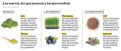 ¿Pasará lo mismo con el kale, la verdura que desde hace dos años viene imponiéndose entre los cultores de la movida healthy a base de sus infinitas propiedades y beneficios para la salud? ¿Y qué sucederá con el matcha, el té verde de hoja entera pulverizada que es otro de los ingredientes del momento? ¿Podrá el teff, el cereal más pequeño del mundo, que es furor en Europa, disputarle el reinado a la quinoa? ¿Y qué pasó con el wheatgrass, la clorofila bebible que tuvo su momento del gloria hace cinco años?