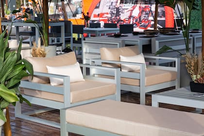La marca expuso en la feria sus completos livings para exterior, barras, mesas y reposeras, desarrollados en aluminio de distintos tonos, combinados con diferentes colores de tapizados: gris, verde, visón, etc. Siempre con la sofisticación de los tonos neutros, que se adaptan a cualquier estilo arquitectónico.