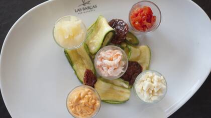 O bien servir cada elemento por separado en un vaso de shot y presentar junto a un colchón de láminas de zucchini y tomates secos hidratados en aceite de oliva.