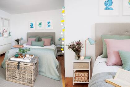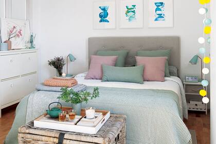 La renovación, a cargo de Sol van Dorssen para el estudio de interiorismo Vestir Tu Casa, logró un cambio drástico sin obra, como es su lema. Engamado con la alfombra, el respaldo forrado remata con un trío de acuarelas de Salva Baixlaigua. Almohadones de lino combinados (Calma House), funda nórdica (Zara Home Barcelona) y manta de punto abierto como pie de cama. Sobre las mesitas de luz, lámparas con pie de metal cobrizo (Maisons du Monde). El baúl de mimbre brinda apoyo auxiliar y sirve para guardar los almohadones.