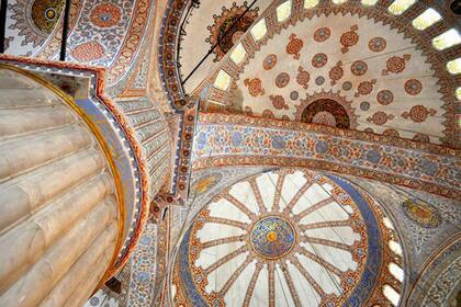 Si pudiéramos ver hacia arriba durante las oraciones, uno perdería su mirada en uno de los 21.043 mosaicos azulísimos traídos de la ciudad de Nicea, en Turquía, con 50 diseños de tulipanes, que transforman sus cúpulas en el equivalente cristiano de la Capilla Sixtina. Uno de los lugares más sagrados del islam. Una cúpula es como un nido puesto del revés, una palma de mano protectora y celestial. Las palomas forman familia allí y la recitación del Corán rueda por ese azul, como si fuera masa en manos de ceramista.