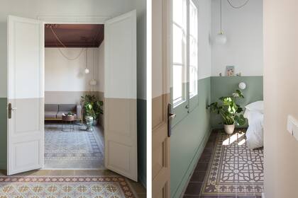 Una guarda de color que recorre paredes, puertas y ventanas amplía visualmente los espacios. Los tonos se eligieron para acompañar la ambientación y destacar los motivos de los típicos pisos hidráulicos catalanes.