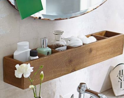 Si no tenés mucho espacio de guardado, pensá en agregar estantes miniatura para colocar en espacios que quizás no habías pensado como debajo del espejo o al lado de la puerta. Hasta la pared más angosta puede servir.