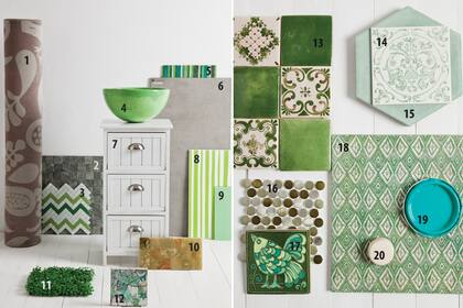 1. Carpeta estampada de 1,20x1,80 ($1.100, El Espartano). 2. Placa ‘Graffito plata’ de 30x60 ($383 c/u, Cortes). 3. Panel ‘Missoni’ de 30x30 ($90 c/u, Carabath). 4. Bacha de cerámica ($990, Batyco). 5. Guarda de vidrio ($248 el m, Batyco). 6. Porcelanato ‘Cement Grey’ de 45x90 ($248 el m2, Fedan). 7. Cajonera ($815, Karina Arc). 8. Cerámico marca Pamesa de 25x50 ($243 c/u, Fedan). 9. Cerámico de 10x30 ($563 el m2, Cortes). 10. Baldosa de ónix de 30x30 ($1.747 el m2, Cortes). 11. Green wall sintético de 25x25 ($258 el m2, Cortes). 12. Toseto de 15x15 ($85 c/u, El Escarabajo). 13. Panel ‘Campiña’ de 20x30 ($140 c/u, Carabath). 14. Azulejo vintage de 15x15 cm ($14 c/u, Deco). 3. Mosaico hexagonal ($125 c/u, Deco). 16. Placa de burbujas de aluminio de 30x30 ($230 c/u, Fedan). 17. Toseto de 12x12 ($32 c/u, El Escarabajo). 18. Placa de Travertino de 30x30 ($166 c/u, Batyco). 19. Pintura látex para interior ‘Ciboulette’ (Colorín Colores Living). 20. Mosaico circular ($290 el m2, Carabath).