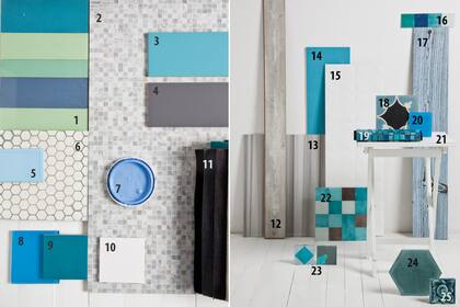 1. Panel de vidrio a rayas ($160 c/u, Deco). 2. Revestimiento ‘Nacare’ de 33x66 ($493 el m2, Barugel Azulay). 3 y 4. Cerámico liso de 10x 30 ($563 el m2, Cortes). 5. Cerámico ‘Subway’ con marco ($372 el m2, Carabath). 6. Mosaico calcáreo ‘Panal’ ($703 el m2, Carabath). 7. Pintura látex para interior ‘Arándano’ (Colorín Colores de Living). 8. Vidrio turquesa de 10x10 ($28 c/u, Marita Cardini). 9. Cerámico texturado ‘Góngora’ ($817 el m2, Barugel Azulay). 10. Cerámico texturado ‘Góngora’ ($723 el m2, Barugel Azulay). 11. Chenille español ($261 el metro, Fedan). 12. Piso flotante suizo ($255 el m2, Fedan). 13. Porcelanato ‘Griggio Mercurio Lapatto’ de 60x60 ($556 el m2, SBG). 14. Cerámico ‘Agatha’ de 25x50 ($304 el m2, Fedan). 15. Placa ‘Diamont’ de 33x100 ($567 el m2, Barugel Azulay). 16. Guarda de vidrio pintada a mano ($148 el m, Batyco). 17. Porcelanato italiano ‘Azzurro 2’ de 20x120 ($837 el m2, SBG). 18. Mosaico calcáreo de 20x20 ($145 el m2, Carabath). 19. Mosaico veneciano ‘Nereida’ de 30x30 ($160 c/u, Fedan). 20. Vidrio de 10x10 ($28 c/u, Marita Cardini). 21. Mesa plegable tapizada en cuero ($850, Domino Deco Bar). 22. Panel de vidrio de 7,5x7,5 ($1.439 el m2, Cortes). 23. Tosetos decorados de 10x10 ($10 c/u, El Escarabajo). 24. Mosaico calcáreo ($125 c/u, Deco). 25. Toseto de piedra París en varios colores ($30 c/u, Deco).
