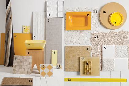 1. Lino rayado ($131 el m, Fedan). 2. Azulejo pintado a mano de 15x15 ($48 c/u, Carabath). 3. Revestimiento de laja de 33x100 ($567 el m2, Barugel Azulay). 4. Mosaico ‘White Infinity’ en placa de 30x30 ($132, Fedan). 5. Revestimiento italiano ‘Griggio’ de 30x120 ($451, SBG). 6. Porcelanato italiano ‘Lux’ de 60x60 ($561 el m2, SBG). 7. Bacha de cerámica ($1025, Batyco). 8. Butaca (Acento). 9. Mármol grabado de 30x30 ($90 c/u, Marita Cardini). 10. Calcáreo de 20x20 ($25 c/u, Deco). 11. Cerámico de 10x30 ($366 el m2, Marita Cardini). 12. Toseto decorado de 10x10 ($10 c/u, El Escarabajo). 13. Alfombra de yute Kalpakian ($286 el m2, Fedan). 14. Placa de nácar de 30x30 ($220 c/u, Marita Cardini). 15. Jabonera ($180, El Escarabajo). 16. Mosaico circular ($290 el m2, Carabath). 17. Pintura látex para interior ‘Girasol’ (Colorín Colores Living). 18. Mosaico con relieve ($180 el m2, Deco). 19. Calcáreo liso de 15x15 ($6 c/u, El Escarabajo). 20. Venecitas de vidrio en placa de 30x30 ($130 c/u, Fedan). 21. Placa de piedritas de 30x30 ($77 c/u, Fedan). 22. Panel de cerámica ‘Reina’ de 20x20 ($86 c/u, Carabath). 23. Listel de vidrio de 2,5x50 ($30 c/u, SBG).