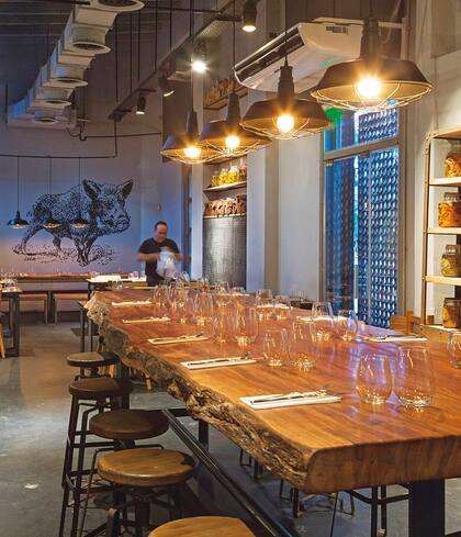 Un jabalí dibujado en el frente de la vieja esquina y la carne guardada celosamente en vitrinas a temperatura controlada. Nacho Trotta y sus socios Alejandro Feraud y Alejandro Luchetti. Estos dos pasaron por el French Culinary Institute de Nueva York, mientras que Nacho cocinó en el glamoroso Chiaroscuro de San Francisco, en el ineludible Berasategui y en varios sofisticados de Buenos Aires. Con semejante técnica acumulada, al ahumado con leña de quebracho y espinillo agrega algo de manzano para perfumar la costilla de vaca tal como se aprecia en la compleja cocina en acero, casi toda a la vista. El chef Trotta balancea el sabor con acidez de los pickles y el kimchi de los vegetales fermentados y controla el humo siempre justo de las parrillas, un horno ahumador y un ahumador tejano.