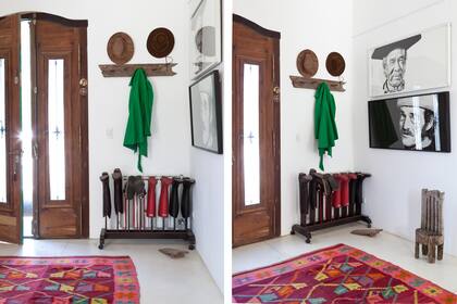 Conocedora y amante de la vida de campo, la fotógrafa Celine Frers eligió los elementos indicados para su casa en San Antonio de Areco: la alfombra marca el ingreso, en una esquina, ubicó el botero y arriba, un perchero hecho hecho en madera rústica y gancho de hierro. El aspecto decorativo está perfectamente resuelto con dos fotografías de la dueña de casa y una sillita matera.