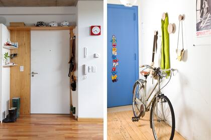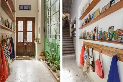 En este departamento, el recibidor se resolvió con estantes de un lado y organizadores fijos en la pared, del otro. La gran idea fue colocar un estante sobre la puerta para guardar otros objetos de uso cotidiano (y no tanto) que estén al alcance de la mano pero no a la vista.