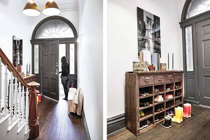 Un mueble potente basta para darle entidad a un espacio. Ejemplo perfecto este aparador comercial comprado en un mercado de pulgas que está en el hall de esta casa de 1851, ubicada en Brooklyn y restaurada por una familia parisina. Arriba, no podía faltar la foto del mítico puente.