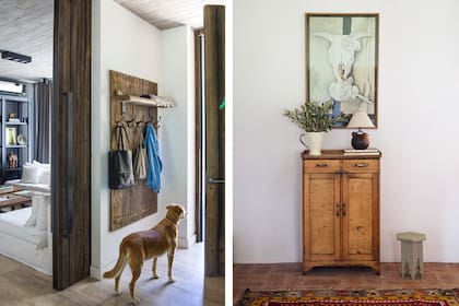 Que un gran amigo te espere en la puerta ya es un gran motivo para tener ganas de volver. Luego, solo queda colgar lo que traemos en el perchero hecho con tablas de lapacho, la misma madera recuperada que se usó para la puerta de entrada y la del family que corre sobre rieles. La madera robusta y cálida a la vez es protagonista en esta casa de fin de semana que se convirtió en residencia permanente.