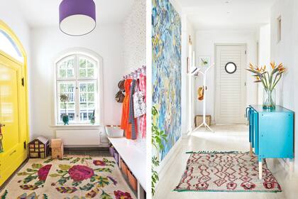 En la imagen de la derecha, el hall de entrada, en tonos de azul vibrante que anticipan los colores del resto de la casa, tiene todo lo que hay que tener: cerca de la puerta, el perchero con pie y una canasta para dejar lo que haga falta. En el pasillo, la alfombra sectoriza y la consola con flores frescas sirve como mueble de apoyo y guardado. Enfrente, una obra de gran tamaño en los mismos colores del mueble.