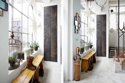 Con gran talento para darle nueva vida a objetos antiguos, los dueños de casa armaron un espacio de recepción vintage: el banco de madera que sirve de apoyo y también para dejar los zapatos, llega justo a la altura de la ventana decorada con macetas. Arriba del paragüero, una composición con espejos, siempre necesarios para una última pasada antes de salir. El detalle lúdico que alegra la vista son las estrellas colgantes