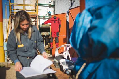 El ruido de las máquinas cubre todo. Debajo, el agua que proviene de uno de los brazos del Río de La Plata se amontona, ingresa a chorros golpeando en las dársenas y filtrándose por las compuertas de la planta de YPF. Alrededor, cruzando los alambrados, los pastizales quemados por el sol dividen la zona: de un lado, Baradero; del otro, Berisso. La luz de la tarde cae, ilumina algunos pedazos del suelo de hormigón dibujando sombras de vigas, válvulas, caños, torres y cables. Una camioneta 4x4 se acerca. Estaciona despacio al borde de una de las entradas subterráneas. Soledad Cuesta baja del vehículo. Le hace una seña a uno de sus ayudantes y se dirige a la parte trasera de la camioneta, acompañada por la vista del buzo de seguridad, quien levanta su mano saludándola. Mantiene medio cuerpo afuera, mientras revuelve un bolso y se sostiene el casco de protección. Unos segundos después, saca un traje de buceo rojo. Comienza a desabrocharse el overol de trabajo, que tiene estampado en letras doradas: Pedro Cuesta & Cia. Una vez que termina, se coloca una remera térmica y un polar, arriba de la ropa que trae puesta. Allá abajo, los últimos días, el agua llegó a estar a 10 grados.