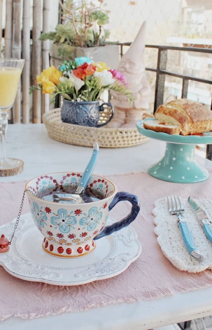 Confiesa que tiene rituales que le dan mucho placer: los fines de semana le gusta desayunar siempre con una taza Anthropologie distinta. "Me levanto temprano, visto la mesa, elijo los textiles, las flores y la vajilla que voy a usar. Después me preparo algo rico de comer y foteo la escena para subirla en mi cuenta de Instagram. Me fascina armar mesas porque me permite dejar de lado por un rato mi parte mental y lógica, para poder desarrollar mi lado creativo, que ama el diseño. Creo que en una de mis mesas de té no podría nunca faltar alguna de mis tazas, flores y una rica torta para compartir".