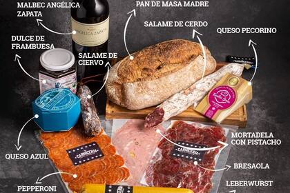 A todo eso, agrega además unas cajitas imperdibles como la Picada Feliz, un combo repleto de sabores para chuparse los dedos. Para empezar, incluye un tremendo Malbec de Angélica Zapata; luego sigue la lista con pan de masa madre, queso azul Blue Sheep, queso pecorino, dulce de frambuesa, leberwurst, mortadela con pistacho, pepperoni, salame de ciervo, salame de cerdo y bresaola. Una bomba de sabor, calidad y variedad, a $4500.
