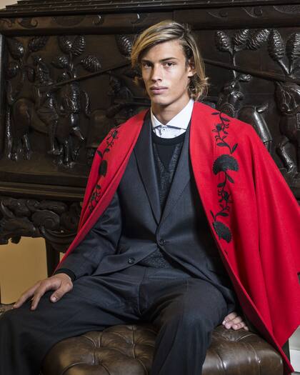 Poncho de lana merino orgánica bordada (Zorzal, $8.750), ambo (Giesso, $12.896), camisa (Garçon García, $2.280), suéter (Perramus, $2.020).