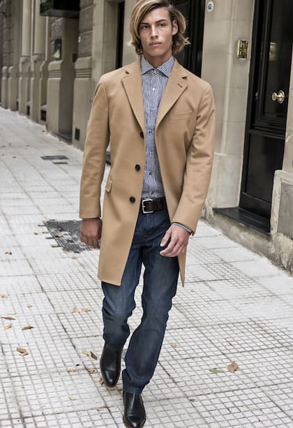 Sobretodo (Etiqueta Negra, $22.000), camisa (Etiqueta Negra, $6.200), jean (Etiqueta Negra, $2.300), cinturón de cuero (Etiqueta Negra, $850), botas de cuero (Perramus, $3.750).