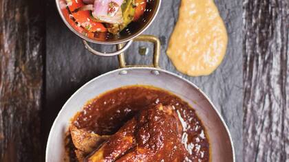 Disponer el cerdo en una rejilla con naranjas, cebollas, ají molido y sal. Preparar el humo con astillas de manzano y ahumar en caliente 2 horas a fuego medio (en ahumador o a la parrilla, mojando la brasa). Para la barbacoa, mezclar los ingredientes y reducir. Para la crema saltear los vegetales picados en manteca y agregar sal, rocoto, miel de caña, comino y canela. Espolvorear con harina, cocinar y agregar leche para alivianar. Sumergir las costillas cocidas en la barbacoa y servir con crema de choclos y vegetales.