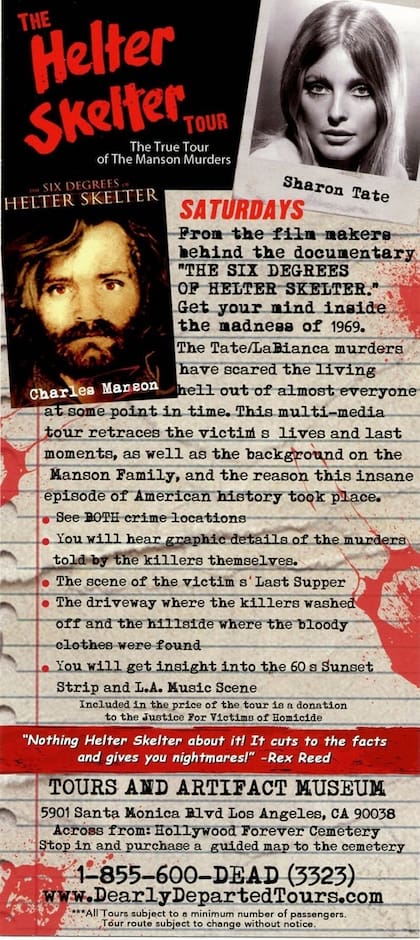 Al final de la calle, a 500 metros, la actriz Sharon Tate –esposa de Roman Polanski, embarazada de 8 meses – fue masacrada junto con otras cuatro personas por un grupo de veinteañeros. Sucedió hace 50 años, el 8 de agosto de 1969. Para muchos, ese día terminaron los 60 en Estados Unidos; para todos, ese día nacióel mito de Charles Manson. Por él estoy acá, junto a otros 12 curiosos, a bordo de la camioneta del Helter Skelter Tour, una excursión que sigue las pistas de uno de los crímenes más resonantes del siglo XX.