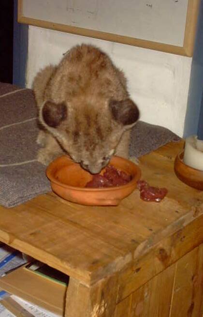 "¿Qué tiempo calculan que tiene?", le preguntó Kai por teléfono a quien cuidaba al pequeño puma mientras ella se apuraba para llegar al lugar. "Un mes y chirolas", le dijeron. Y de allí nació su nombre. "Es evidente que había sido una mascota. Pero lo que la gente no se sabe es que llega un punto en que los tienen que soltar porque el puma no puede ser mascota. En primer lugar su instinto hace que no sea doméstico. Además, su tenencia es ilegal", aclara. Y sigue: "en Córdoba hay muchos casos de pumas como mascotas. Se los somete a amputaciones de sus garras, colmillos y castración temprana con la pretensión de tenerlos mansos. No es suficiente, el instinto no se puede amputar. Ellos a los 8 meses maduran hormonalmente, es la edad en que su madre les enseña a cazar. Y sus gestos de juego son los mismos de la cacería. Es decir, si un dueño juega con su puma mascota, el puma hace manotazo, manotazo y mordizco repetidas veces. Por lo que se tiene que encadenar, enjaular, y toma un lugar relegado dentro de una casa común, porque obviamente es peligroso para la seguridad de una familia, de un barrio... Es tambien la edad en que los dueños acuden a zoos y reservas para reubicarlos".