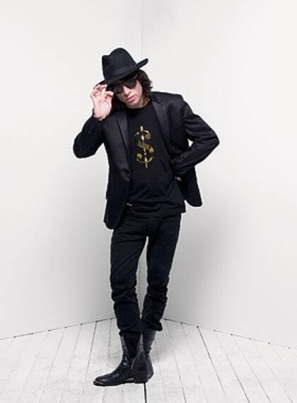 Saco entallado de gabardina negra [A.Y. Not Dead]. Remera negra con estampa dorada de su nueva banda: $ponsors". Skinny jeans negros [A.Y. Not Dead]. Sombrero negro de pana [Lagomarsino]. Lentes Wayfarer [Ray-Ban]. Botas negras de cuero con puntera de metal [Alexandre Herchcovitch].