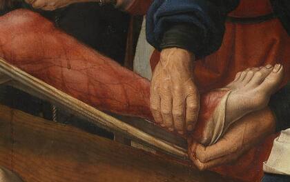 El detalle clave. Uno de los verdugos se encuentra con las dos manos ocupadas porque está despegando con fuerza la piel de la carne. Mientras hace eso sostiene el cuchillo entre los dientes.