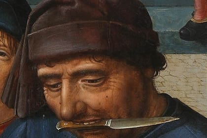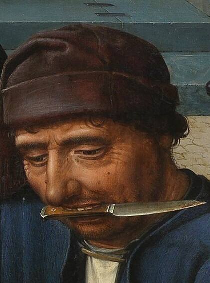 Se puede rastrear el cuchillo entre los dientes en la historia de la pintura. Una de ellas es considerada una de las obras de arte más crueles que se hayan pintado. Se trata de un díptico que cuenta la historia de un juez que vivió hace 2500 años. Los protagonistas son el juez Sisamnes, el rey Cambises II y Ótanes, el hijo del juez.