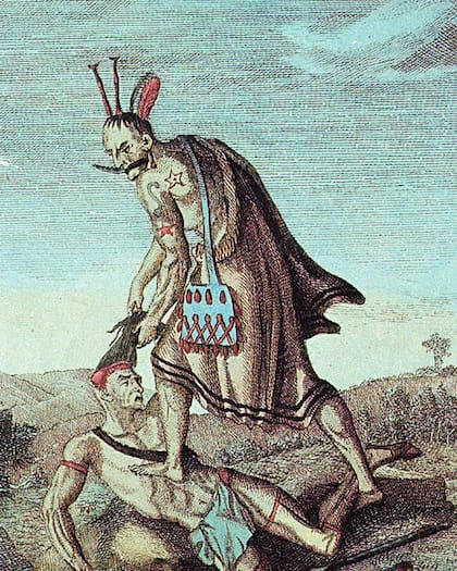 La siguiente ilustración muestra la maniobra que utilizaban los Sioux para quitar el cuero cabelludo de una de sus víctimas, en este caso viva. Luego de realizar las incisiones en la frente y las sienes, el agresor toma el cabello y tira hacia atrás para desprender el tejido del cráneo como si fuese una gorra, al mismo tiempo que empuja con el pie el cuerpo de la víctima hacia adelante. Mientras hace esto sostiene el cuchillo entre los dientes.