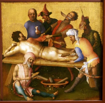 La imagen que sigue- muy rara- muestra a San Bartolomé siendo desollado boca abajo. Nuevamente uno de los verdugos forcejea para arrancar la piel. Hace tanta fuerza que tiene que tirarse hacia atrás mientras tensa las manos. Al mismo tiempo sostiene el cuchillo curvo entre los dientes. Abajo un ayudante afila más cuchillos.