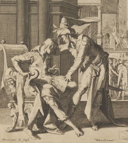 Detalle: Horrorizado, Ótanes se resiste a sentarse pero es empujado por Cambises II para ocupar el sillón tapizado con la piel de su padre