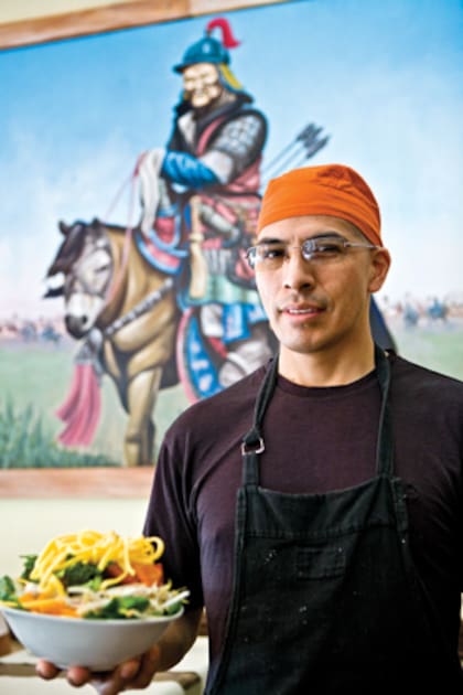 Gengis’ House es un lugar raro. Por lo menos acá: según explica el chef Nicolás Sena, el grill mongol es bastante popular en Europa, Asia y Estados Unidos. Después de perfeccionarse y cocinar con esta técnica en Los Ángeles, Nicolás decidió venir a Buenos Aires para estar cerca de su familia y traer esta propuesta gastronómica distinta. En Gengis’ vos mismo elegís los ingredientes que van a ir luego al grill, una chapa redonda hipercaliente donde se saltea todo junto. El lugar es tranquilo, muy apto para almuerzos al paso y cenas rápidas antes o después de otro plan nocturno. Todo prolijito, limpito y ordenado, elegís de una suerte de bufet con gran variedad: fetas de cerdo, pollo, carne de vaca o camarones; verduras de todos los colores, desde hojas de espinaca hasta calabaza en juliana y cilantro; ananá, champiñones o tofu. Lo que quieras, en las proporciones que elijas, van a parar a tu bol. Nicolás recomienda combinar cerdo, verdeo y ananá, un clásico a prueba de fallas. Después, elegís el hidrato para acompañar: pueden ser fideos de arroz, integrales o de sémola, o un simple arroz blanco al vapor. Las salsas que ofrecen son de ostras, ajo, barbacoa, jengibre, limón y condimento picante. Si los dejás elegir a ellos, usan todo junto para saltear tu porción: en la mesa, además, hay salsa teriyaki, salsa de soja y semillas tostadas de sésamo para condimentar. Quizá la versión oriental del ketchup, mayonesa y mostaza para este fast food exótico. Cada bol sale $42, y hay promo con bebidas a $54 al mediodía. El postre no es la vedette, pero tienen una "mongolian cream" para los golosos que necesitan terminar siempre con algo dulce.El sistema, en realidad, de mongol no tiene nada. Pero sí es asiático: se creó en los 70 en Taiwán, y tuvo un éxito inmediato. La primerísima Mongolian Barbecue abrió en Taipéi en 1976 y se llamó justamente Genghis Khan Mongolian BBQ. Es una técnica que se parece bastante al teppanyaki japonés, con la vuelta de tuerca del método "elige tu propia aventura" para ingredientes y sazón. Lo bueno es que es bastante saludable (por la poca grasa necesaria para la cocción y el equilibrio entre proteínas, hidratos y vegetales) y que es muy adaptable a los gustos de cada quien. Podés pedir tu porción sin sal, con más o menos carne, verduras, fideos, salsas... a la medida del comensal y sus caprichos.