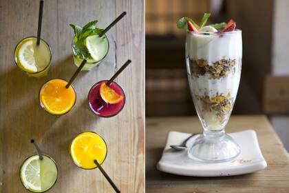 Puro color con limonadas y jugos naturales. El yogurt se puede servir en un copa con granola (se consigue en dietéticas), miel orgánica, sésamo y fruta fresca.