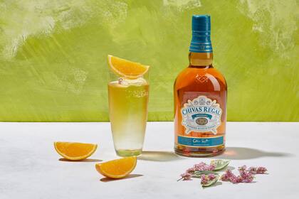 Un viaje de Japón a Escocia: así es el nuevo Chivas Mizunara, un blend de whiskies escoceses añejado en unas exclusivas barricas de roble japonés, que le dan al whisky un sutil especiado final. Aromas intensos y complejos, que se perciben en este cóctel con manzanilla, aperitivo de naranja y soda. Delicia.