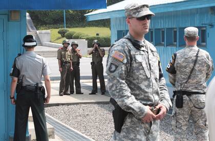 Dos soldados surcoreanos vigilan todo detrás de sus lentes oscuros, inmóviles como robots. El chasquido de las fotografías no los conmueve; tampoco la charlatanería de los visitantes. Estarán así durante las próximas dos horas, hasta que puedan tomar un breve descanso. El turno completo es de doce horas. Del lado Norte también hay una puerta: si se abre y entran los enemigos del soldado Smith, el consejo es no retroceder. Si ellos nos sacan fotos (con los posibles fines de usarlas como propaganda política de regreso en Pyongyang, mostrándonos como capitalistas maleducados), nosotros podemos tomarles fotos a ellos.