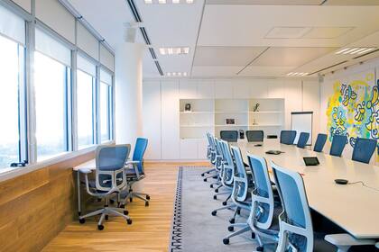 La sala de reuniones circular, en la planta superior, se delimitó con mobiliario de MDF enchapado en roble con algunas aberturas vidriadas que permiten el paso de la luz natural. En el interior, mesas de hierro (Hábito) rodeadas por un sillón curvo con almohadones diseñado por el estudio de Paula de Elía. Para la iluminación, cielo raso tensado circular (Barrisol) sobre luces led cálidas.