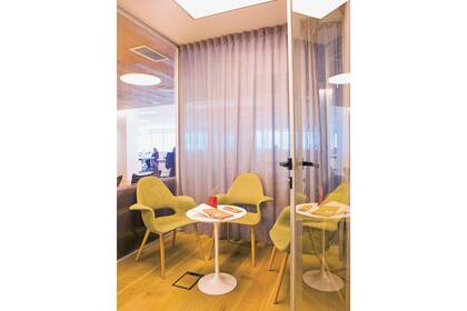 Las salas de reuniones más pequeñas, para encuentros o llamadas breves, se hicieron vidriadas y se equiparon con sillas ‘Organic Soft Cover’ y mesas ‘Tulip’ (Fauna). Los murales, montados sobre placas de madera moduladas de acuerdo a cada espacio, son obra colectiva de los jóvenes artistas Mart Aire, Tode y Tester, coordinados por Timoteo Lacroze en línea con el estilo fresco planteado por el estudio y la empresa.