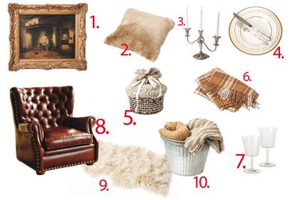 1. Cuadro ($1.900, Tienda Decosabores). 2. Almohadón de 0,40x0,40 en piel sintética ($350, Everything but the Cat). 3. Candelabro Sheffield de plata inglesa ($1.500, La Melange) con velas blancas ($39, The Candle Shop). 4. Cubiertos ($4.000 el juego de 12) con plato de postre ($120) y plato playo ingleses ($150, todo de Decovintage New). 5. Cesto de tiento con tapa de lana ($570, Paysana). 6. Manta de alpaca de 1,30x1,80 ($4.200, Entredos Casa). 7. Copas labradas ($90 c/u, Decovintage New). 8. Sillón Bergère de un cuerpo ($15.900, Krandalls). 9. Corderito de pelo largo sintético de 0,60x0,90 ($750, Everything but the Cat). 10. Dentro del tacho para bebidas ($3.150, La Ferme) manta marrón de mohair de 1,70x1,20 ($2.600, Luna Deco) y manta beige de algodón de 1x1,80 ($2.500, Luna Deco).
