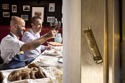 En la foto, la clásica mezuzá (receptáculo que contiene un pergamino con dos versículos de la Torá y se adhiere al marco de la puerta de entrada) nos recibe en Mishiguene. Al lado, el arquitecto Billy Gutraich, a cargo de la ambientación, brinda con el chef. "La sensación de llegar a casa y sentirte cómodo y bienvenido fue una de las premisas principales al armar el proyecto", nos cuenta Kalika.