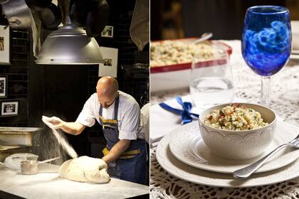 Tomás Kalika preparando el pan en la cocina abierta de Mishinguene. Sobre el mantel a crochet ($2.331), copas azules ($169 c/u), candelabros de vidrio ($869 los tres, todo de Compañía Nativa) y vajilla de loza blanca labrada (Entrance). "Al ambientar Mishiguene, quisimos evocar el sentimiento que se tiene al cenar en la mesa de la cocina, donde las fuentes de comida dispuestas en el medio se comparten entre todos", nos cuenta el arquitecto Billy Gutraich.