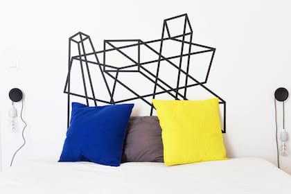 "Hice estos prismas con cinta washi, uno por uno, hasta encontrar la armonía justa. La idea es cambiarlos cuando nos cansen; pero si hay equilibro, uno no se cansa tan fácil", cuenta el artista argentino Mateo Andrea acerca de la obra propia que corona la cama de su departamento en París. Si hay ideas y sobra audacia, la pared de la cabecera puede ser un tentador lienzo en blanco para dejar fluir expresión y creatividad.