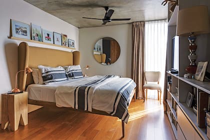 Una foto enmarcada, propia o no puede ser la elegida para que sea lo último que veamos antes de dormir y también puede ser el disparador del resto de la ambientación del dormitorio. "Me costó armar mi cuarto… hasta que encontré esta foto de un viaje al sur. Cuando decidí que iba a ser la cabecera, se empezó a organizar el conjunto", cuenta Sabrina Aides, dueña de casa y parte del estudio de decoración Lodd. El resultado es un conjunto sereno y cálido en tonos neutros, piso de incienso y una cómoda (Encaja Muebles) con el tamaño perfecto para funcionar, además, como mesa de luz.