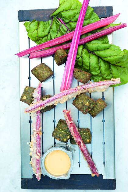 De las variedades de acelga a la mano, el chef elige unas llamativas, con la penca roja en lugar de la acostumbrada blanca. Al igual que otras con el tallo multicolor (llamadas rainbow), provienen de semillas traídas de Holanda que se han adaptado muy bien en el territorio y clima bonaerenses.