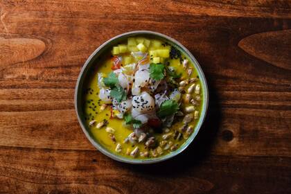 Siempre es de pesca blanca (lo más fresco que encuentren, sea mero, besugo, lisa u otros), que primero curan por una hora en una mezcla de agua, sal, azúcar y alga kombu. "Esto le da un sabor a mar increíble, y a la vez ayuda a que el pescado se mantenga jugoso y tierno al mismo tiempo", explica Paúl Porras, uno de los socios detrás del lugar. Luego preparan una leche de tigre procesando jengibre, ajo, miel, lima, limón, gotas de aceite de sésamo, apenas un poquito de fumé de pescado y ají amarillo previamente blanqueado. Se mezcla con el pescado y llega a la mesa con maíz chuspillo (tostado y crujiente), cebolla morada, mango cortado en cubitos, cilantro, sésamo negro, rodajas de jalapeño y chips de mandioca. Una explosión de sabor latino en la boca. Dirección: Beauchef 527